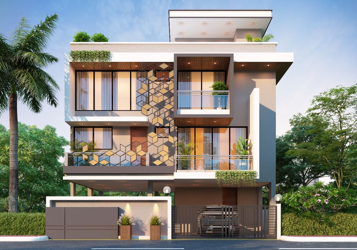 •This modern residence design presents a dynamic and multi-layered facade. The home's exterior is defined by a curated mix of textures, including smooth grey plaster, warm wood-effect paneling, and an intricate hexagonal screen that serves as a focal point. Large windows and glass railings on the balconies blur the line between indoor and outdoor spaces, while carefully placed planters and integrated greenery soften the structure's sharp lines. The design successfully combines geometric elements with natural textures to create a sophisticated and inviting curb appeal.